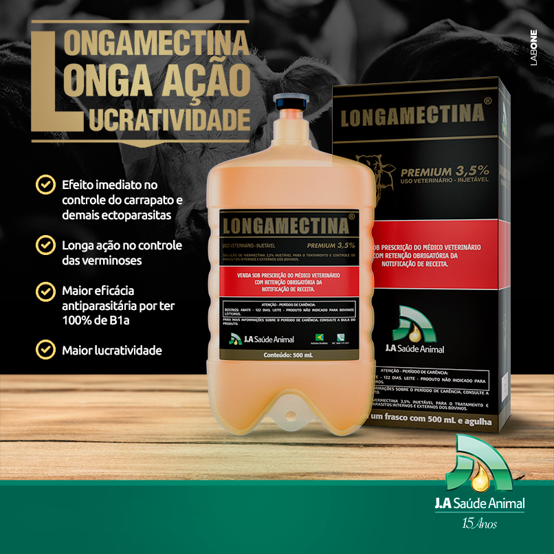 Longamectina® Premium 3,5% é um endectocida altamente concentrado e de longa ação, que combate as verminoses e os ectoparasitas, como carrapatos e bernes. Apresenta formulação ajustada a 100% de B1a, que é a fração da Ivermectina realmente eficaz contra os parasitas.